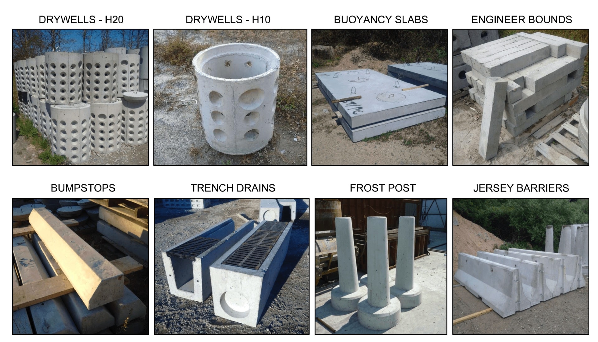 Miscellaneous Building Products: This section is where smaller precast products are grouped that can help the builder accommodate unique job requirements. Product uses range from surveyor markers to roadway barricades to smaller volume drainage applications.