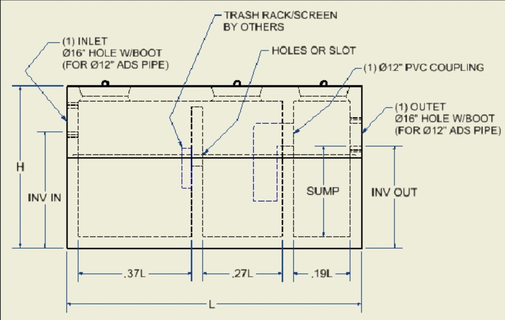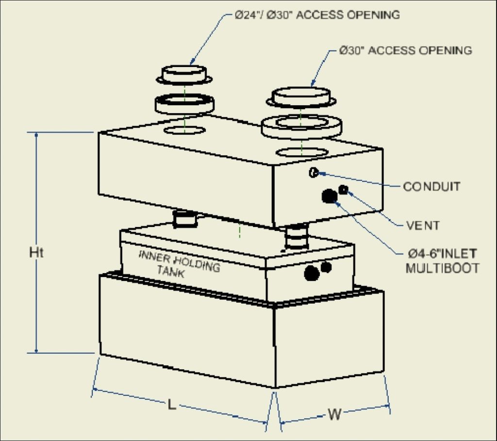 SPECIALTY TANKS: These precast structures enable the end user to perform more specific types of processes such as safely storing Non-hazardous Industrial wastewater in a double walled storage tank. This tank comes with floats & alarms. There are also tanks with 2 internal baffle walls that can be used to separate oil & grit from flow. These tanks are typically customized with additional screens and pipework by the end-user to suit the process.