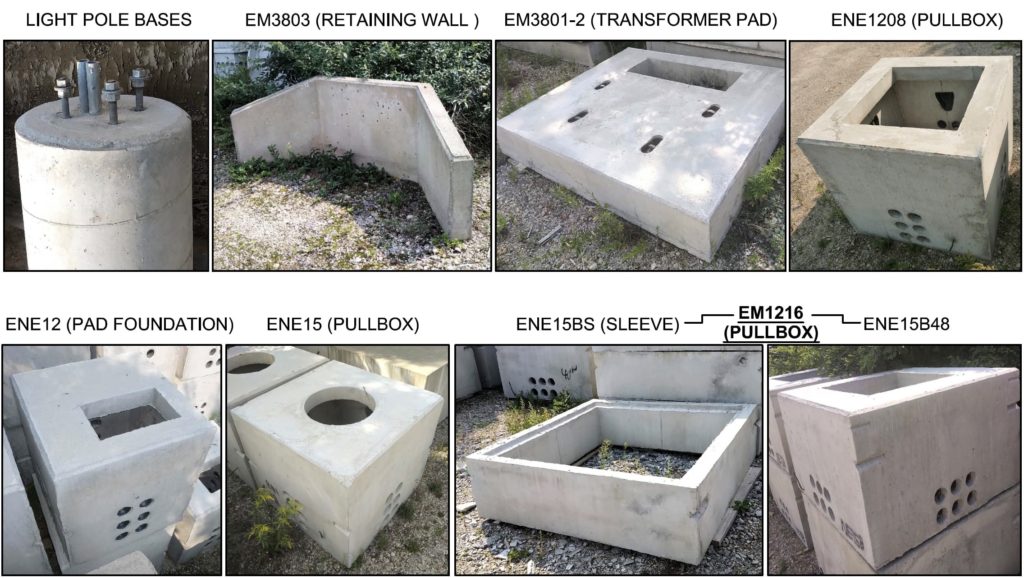 UTILITY PRODUCTS: These precast products support and protect electrical applications. Acmeshorey offers customized light pole bases ranging from 12″ to 24″ diameters. Another important product line offered are transformer pads & pull boxes as used by Eversource.